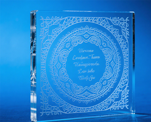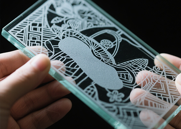ஒரு CO₂ லேசர் கண்ணாடி மேற்பரப்பால் நன்கு உறிஞ்சப்படுகிறது மற்றும் பொதுவாக மேற்பரப்பு வேலைப்பாடுகளுக்குப் பயன்படுத்தப்படுகிறது. CO₂ லேசரின் வேலைப்பாடு விளைவு ஒரு உறைந்த, வெள்ளை வடிவமாகத் தோன்றுகிறது, இது விளம்பரம், கலை அலங்காரம் மற்றும் பரிசு எழுத்துகளுக்கு ஏற்றதாக அமைகிறது. புற ஊதா (UV) லேசர்கள், மறுபுறம், ஒரு குறுகிய அலைநீளத்தைக் கொண்டுள்ளது மற்றும் குறைந்தபட்ச வெப்ப-பாதிக்கப்பட்ட மண்டலத்துடன் "குளிர் செயலாக்க" முறையில் இயங்குகிறது. UV லேசர்கள் நுண்ணிய கோடுகள், QR குறியீடுகள் மற்றும் லோகோக்களை உருவாக்கும் திறன் கொண்டவை.